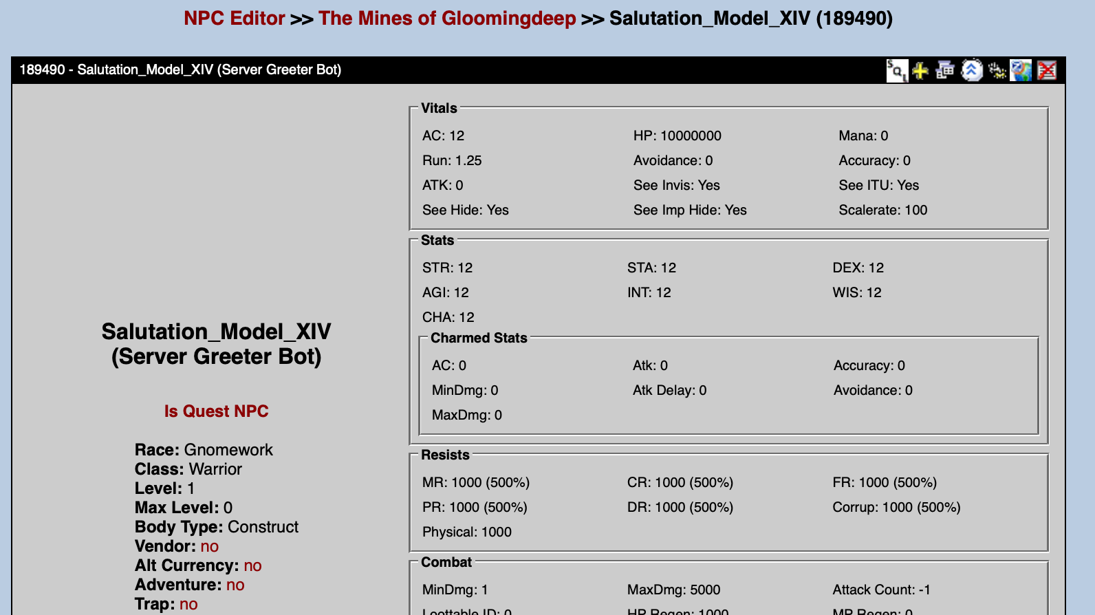 For our Server Greeter Bot, we are going to input the NPC Name as "Salutation_Model_XIV", select the 457 - Gnomework race, with a 5 - Construct bodytype setting, gender Neuter. These options will cause the NPC to display correctly to the client. Be sure to also place a checkmark in the following boxes: Will Not Aggro (24), Immune to Aggro (25), and Has Quest File. The rest of the settings are entirely up to you. You can choose to match the settings below for the purposes of this guide. We do want our Greeter Bot to be noticeable, so we have increased the size to 10. We also don't want our Greeter Bot to be accidentally killed, so we have made the NPC quite resilient by granting ridiculous HP and resist.