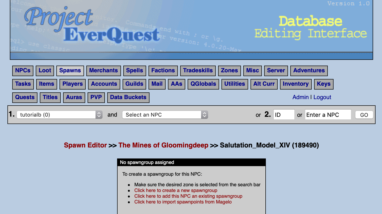 We will work on creating an NPC in the Tutorial (tutorialb). Select the tutorialb from the zone list pull-down: