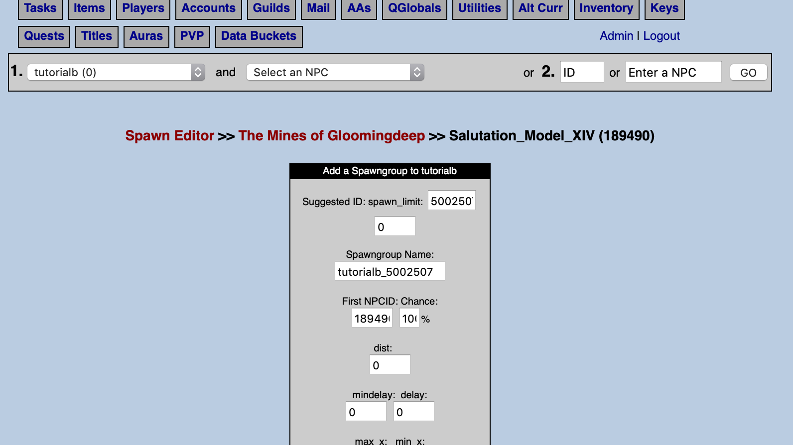 A Spawngroup is a grouping of one or more NPCs. A Spawngroup can have one member, which will be the case for our Greeter Bot, or it can have many members; a Spawngroup with many members can create a more random feel for your world, since the same NPC may not always appear. You can review the fields in database table on the spawngroup page (opens new window) in the Database Schema documentation.